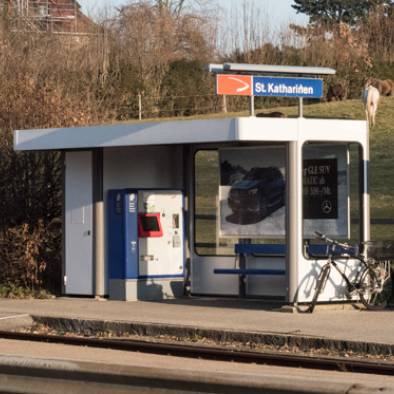 Die Haltestelle St. Katharinen verbleibt an ihrem heutigen Standort. Neu wird ein Mittelperron zwischen den beiden Gleisen erstellt. Von diesem aus kann auf beide Seiten in die Züge ein- und ausgestiegen werden. Der Perron wird mit einem Perrondach ausgestattet und behindertengerecht ausgebaut. Auf dem Areal südwestlich der Haltestelle wird zudem ein neues Dienstgebäude für den Bahnbetrieb errichtet. Es enthält Bahntechnik zur Steuerung des Abschnittes Baselstrasse.